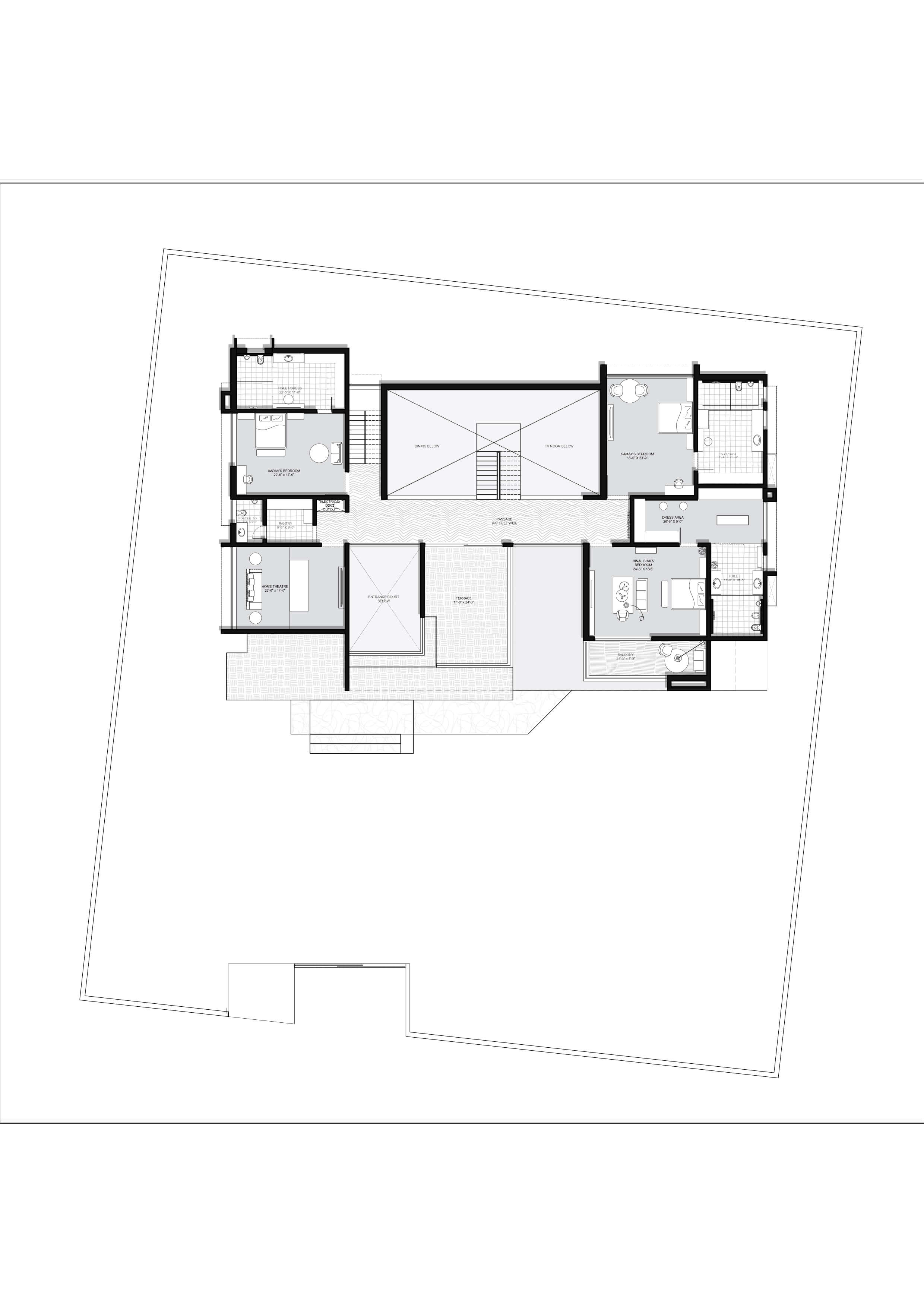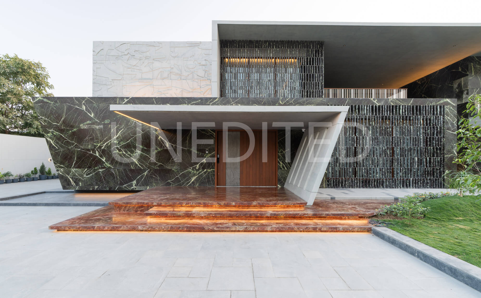 Kameshwar Omkar reflects the belief that when materials are used with intent, their potential is limitless. The residence showcases exposed patterned concrete, an angular canopy, and crafted stonework—each element revealing the structure’s honesty and artistry. Balancing openness with privacy, the architecture embraces light, texture, and proportion to shape meaningful spatial experiences. Rooted in Upkrama’s ethos of purity and detail, Kameshwar Omkar transforms material expression into refined living.