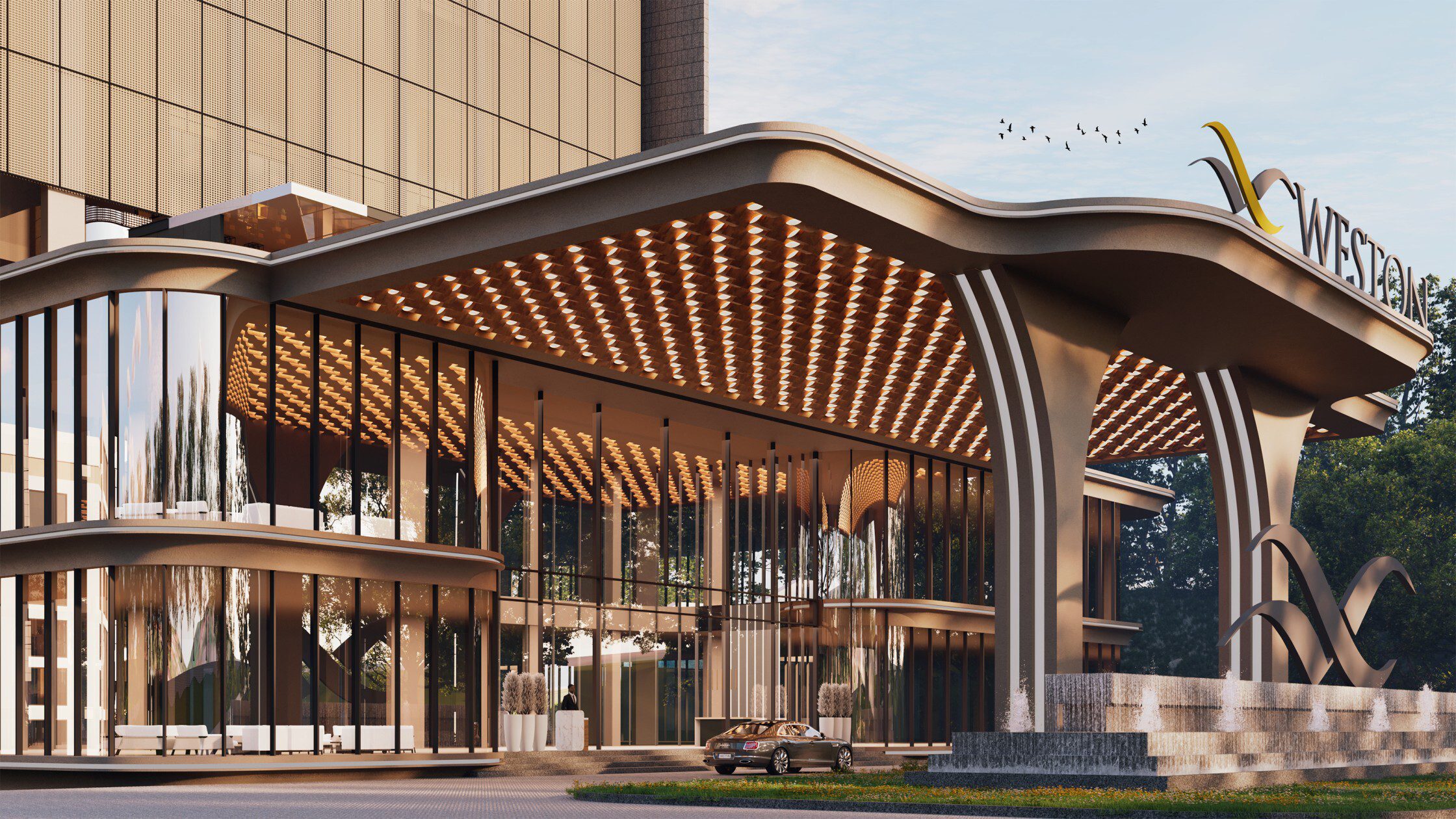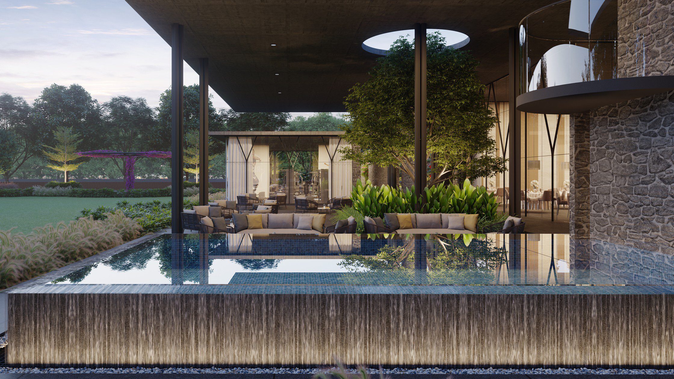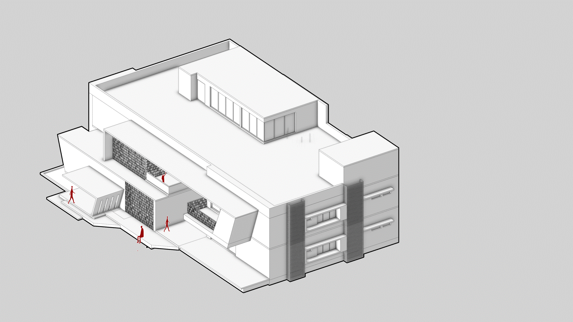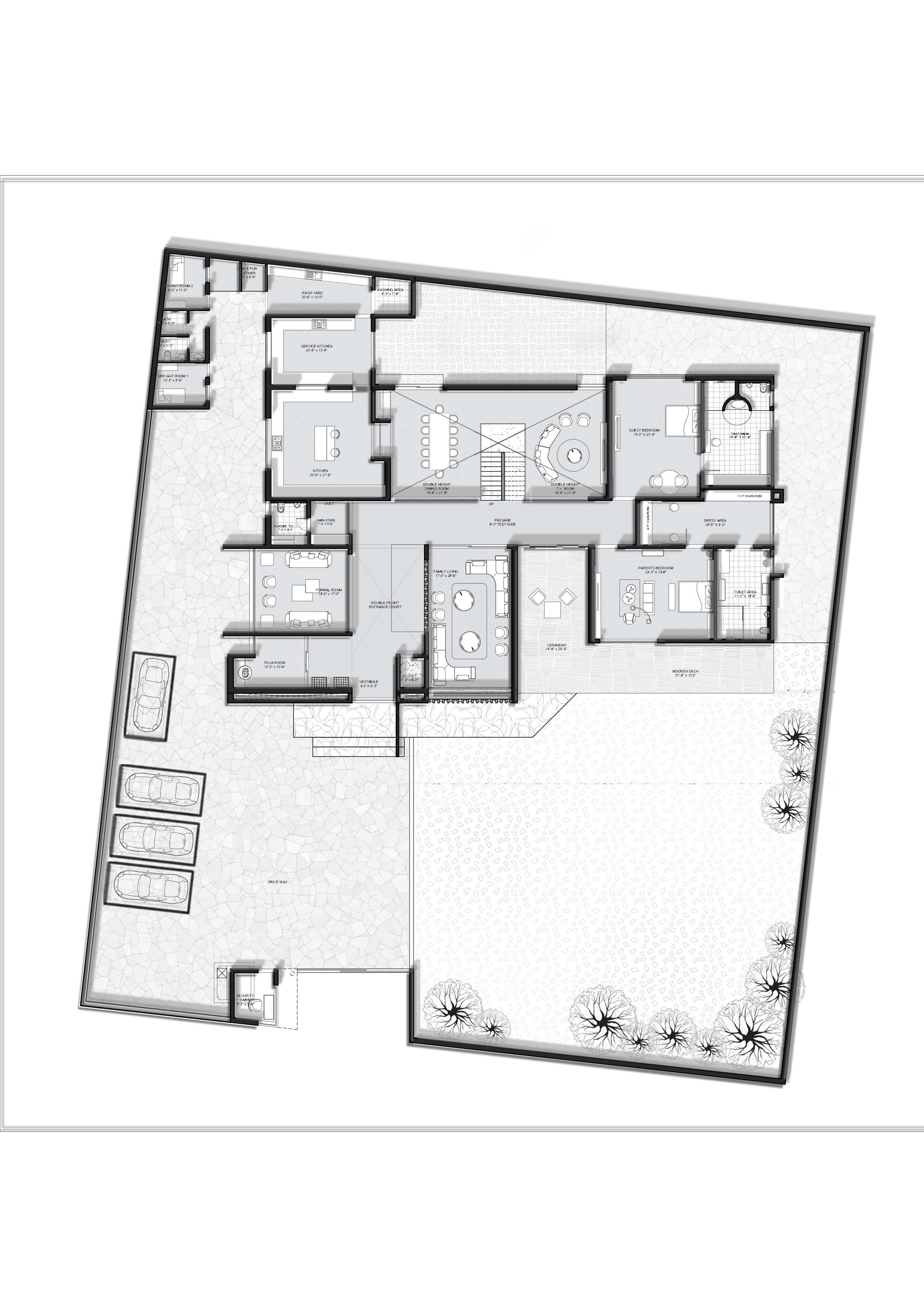 A sculptural isometric narrative revealing a luxurious bungalow where exposed RCC and natural stone express structural honesty and permanence. Double-height volumes, a central floating staircase, marble screens, and bold cantilevered slabs unfold layer by layer, highlighting the interplay of mass, void, and refined materiality.